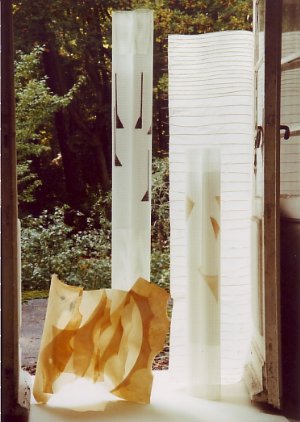 Objekte aus lichtdurchlässigen Materialien wie Papier, Pergament und Kunststoffgittergewebe, räumlich verformt - entstanden im Jahr 2000 bei einem Symposium des Kunstvereins Graal-Müritz zum Gegenstand Buch.