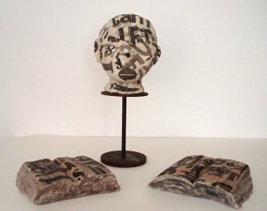 - Der Denker, 2009, Paperclay, Gips, bedrucktes Papier, 70 cm X 80 cm