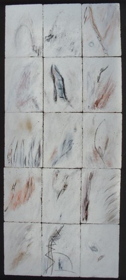 - Ein Wintermärchen II, 2001, Gegossenes Papiermache, gessogrundiert, mit Kohle, Holzasche und Pigmenten bemalt, 210 cm x 150 cm, 16-teilig